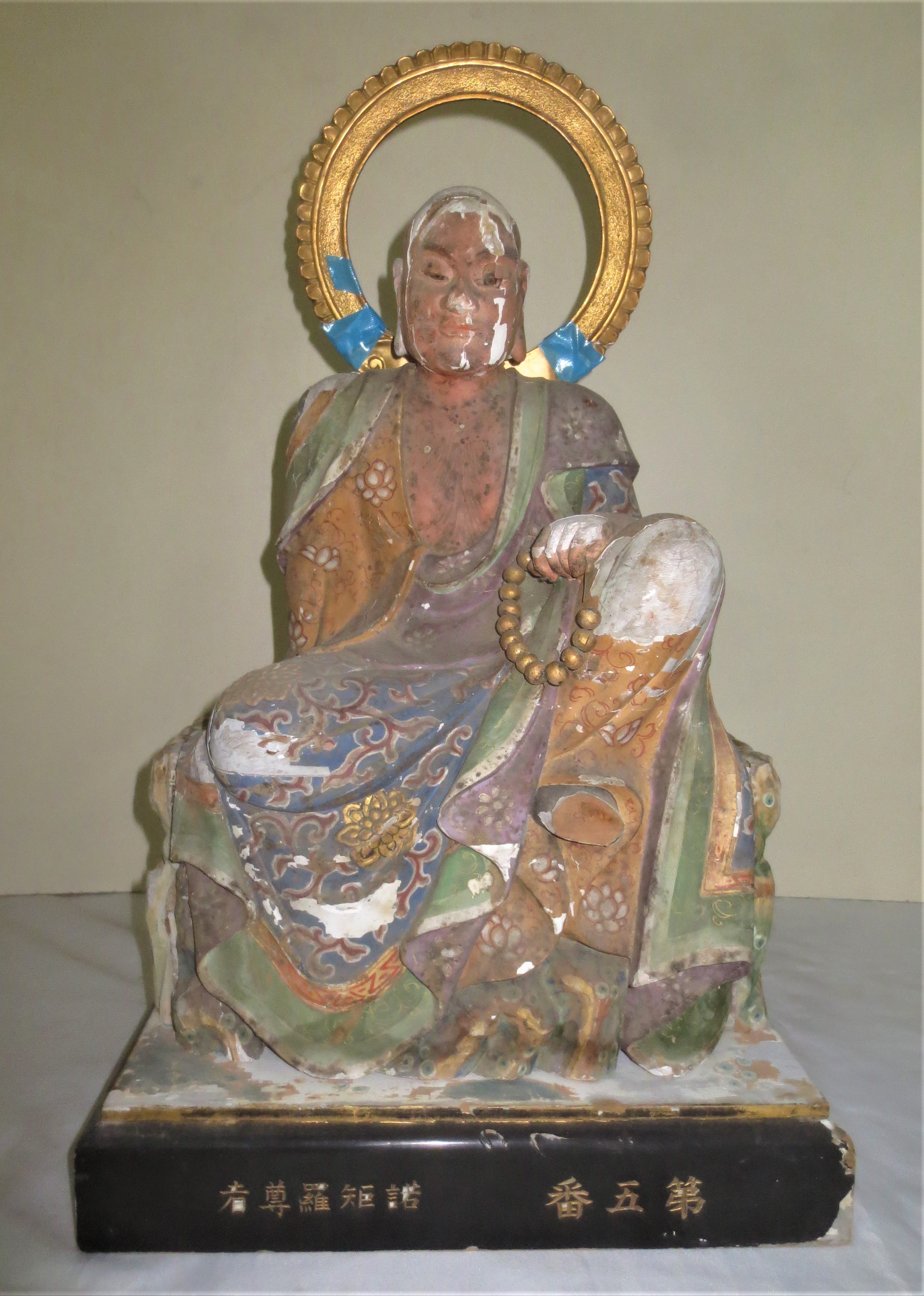 [大阿羅漢]諾矩羅〈なくら〉像の修復 2021年6月1日 諾矩羅〈なくら〉像を修復致しました 修復のご協力誠に有り難うございました。山主合掌 施主:鳥取県 H寺様 修復内容:造形完全修復。単色彩色仕上げ 安置場所:開山堂正面、釈迦如来像脇に安置 ※以下、修復前の様子 諾矩羅〈なくら〉尊者について 十六羅漢中、第五尊目にあたる諾矩羅尊者。 須弥山〈しゅみせん〉の南にある南贍部州〈なんせんぶしゅう〉に住み、お釈迦様に命じられ、涅槃(ねはん)に入らず正法〈しょうぼう〉を守り衆生を救います。