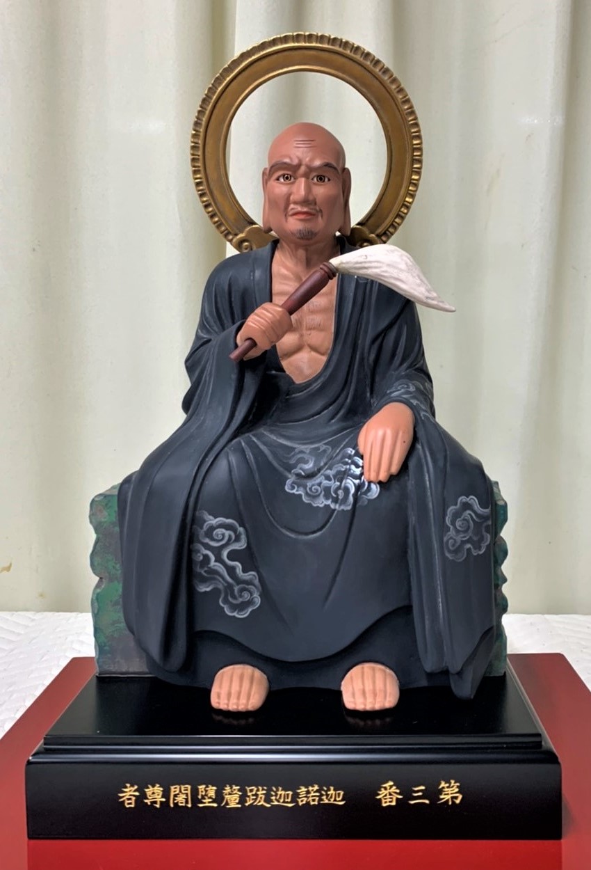 [大阿羅漢]迦諾迦跋釐堕闍〈かなかばりだじゃ〉像の修復 2021年6月1日 迦諾迦跋釐堕闍〈かなかばりだじゃ〉像を修復致しました 修復のご協力誠に有り難うございました。山主合掌 施主:江田島市 K様 修復内容:造形完全修復。単色彩色仕上げ 安置場所:開山堂正面、釈迦如来像脇 ※以下、修復前の様子 迦諾迦跋釐堕闍〈かなかばりだじゃ〉尊者について 十六羅漢中、第三尊目にあたります。 須弥山〈しゅみせん〉をとりまく四大州の一つ東勝身〈とうしょうしん〉に住み、お釈迦様に命じられ涅槃〈ねはん〉に入らず正法〈しょうぼう〉を守り衆生を救います。