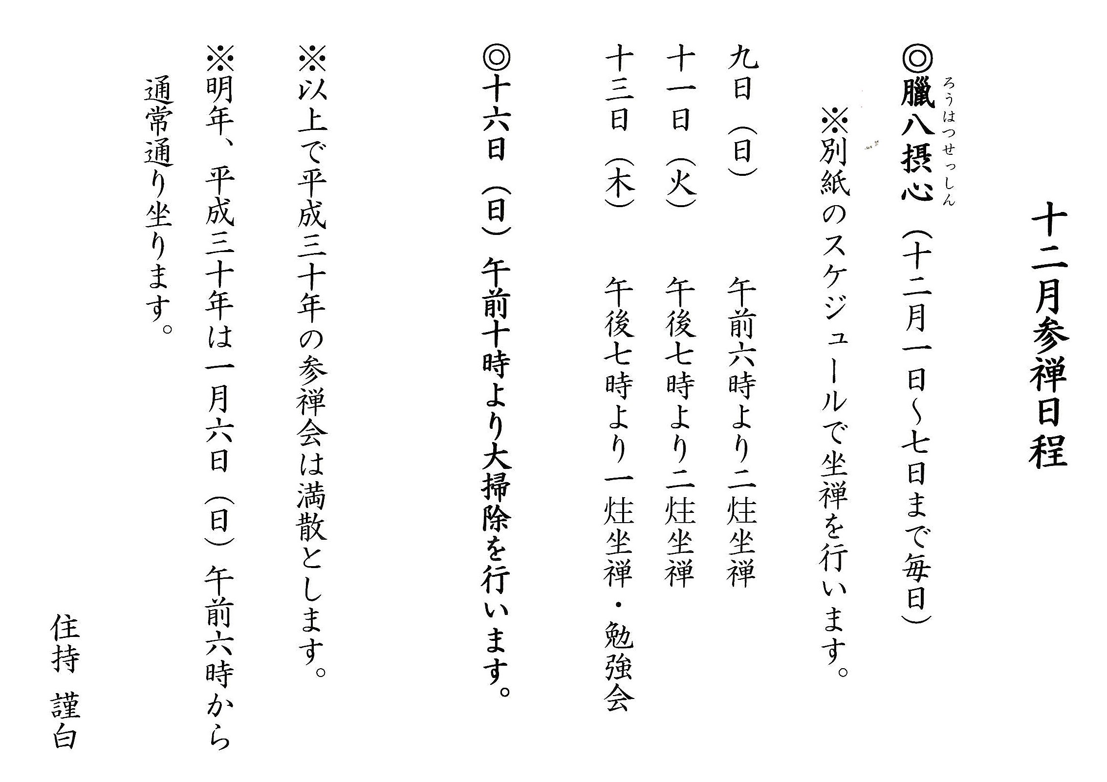 12月参禅日程および臘八摂心のご案内