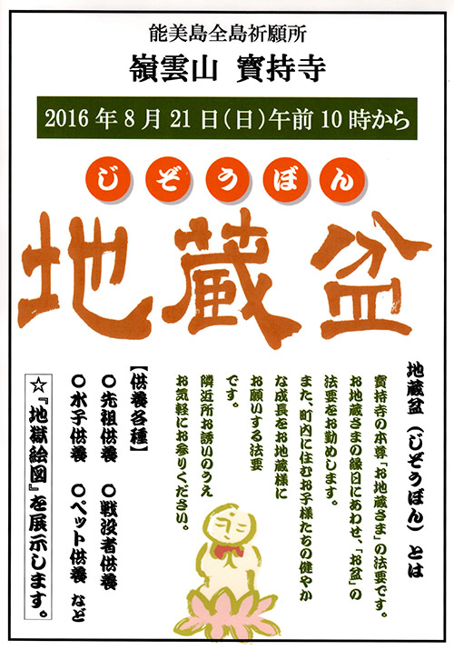 地蔵盆法要(じぞうぼんほうよう) 2016年8月21日 地蔵盆法要(じぞうぼんほうよう) 2016年8月21日(日) 午前10時から 地蔵盆法要(じぞうぼんほうよう)を厳修します。 寳持寺伝統行事の1つ。 寳持寺のご本尊「お地蔵さま」の縁日にあわせ、お盆の法要を営みます。 また、地域に住むお子様たちの健やかな成長を「お地蔵さま」にお願いします。 先祖供養・戦没者供養・水子供養・ペット供養 等、各種供養を受け付けます。 ご家族で、お気軽にお参りください。 ※寳持寺「くぬき地蔵」をお持ちの方は、法要中お清め致しますので、当日受付までお持ちください。